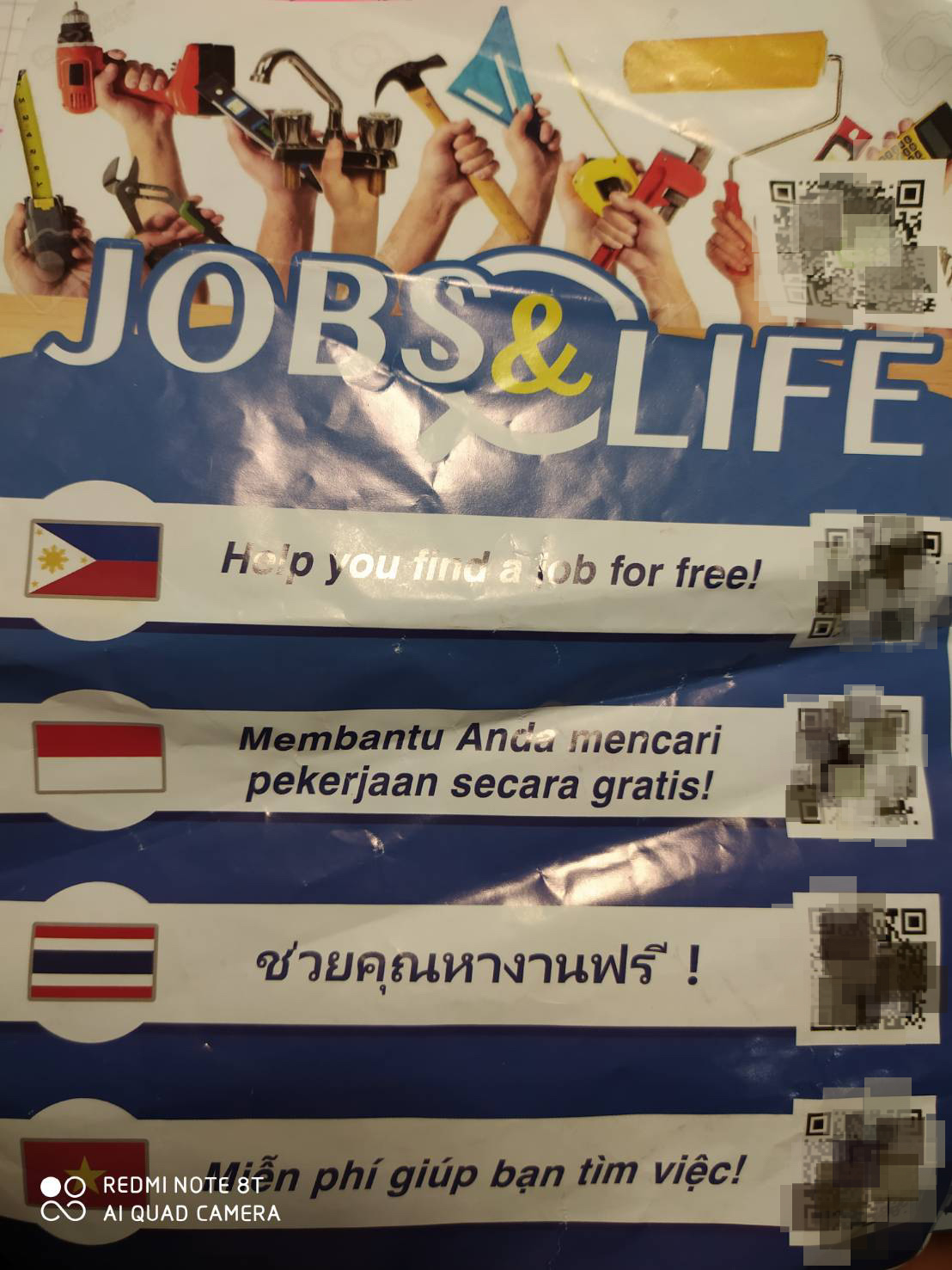 ▲不少仲介業者在醫院、公園及印尼商店發傳單,只要手機掃QR Code、填入背景資料後,可收到相關工作資訊。圖片來源:今周刊,蕭婷方翻攝